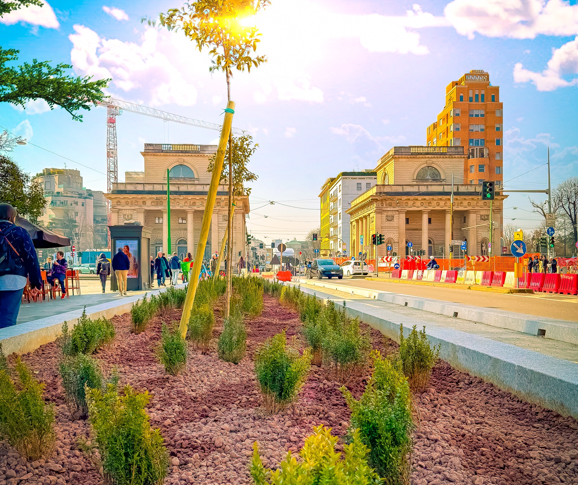 Dopo una prima realizzazione della ciclabile con cordoli nel 2023, si procederà con l’allargamento dei marciapiedi e l’inserimento di aiuole e piantumazioni, le cui dimensione varieranno a seconda dello spazio disponibile, dei sottoservizi presenti e della quota della soletta della linea M1. Le vasche saranno più ampie dove la via è più larga, come nei pressi di piazza Oberdan, e più ridotte per non limitare lo spazio riservato ai pedoni, nel tratto verso piazzale Loreto.